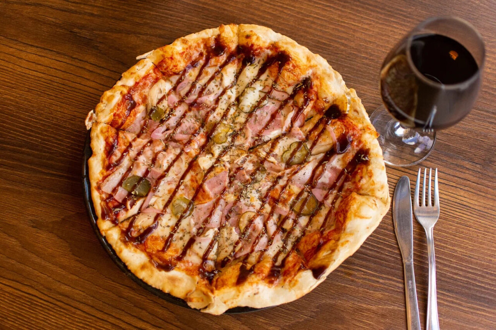 Тесто, соус «Пелати», соус «Барбекю», сыр «Моцарелла», ветчина копчёно-варёная, бекон, огурец маринованный, лук маринованный, филе цыпленка, специи