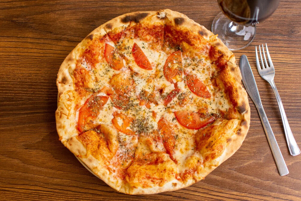 Тесто, соус «Пелати», сыр «Моцарелла», томаты, специи