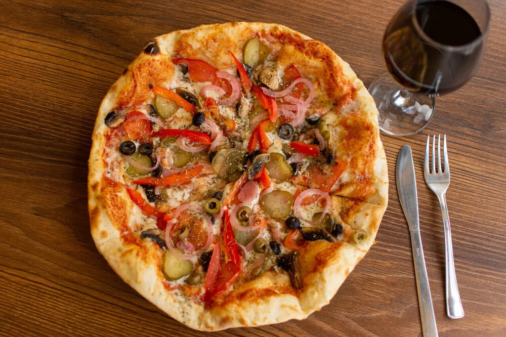 Тесто, соус «Пелати», сыр «Моцарелла», маслины, шампиньоны, цукини, перец сладкий, кукуруза, специи