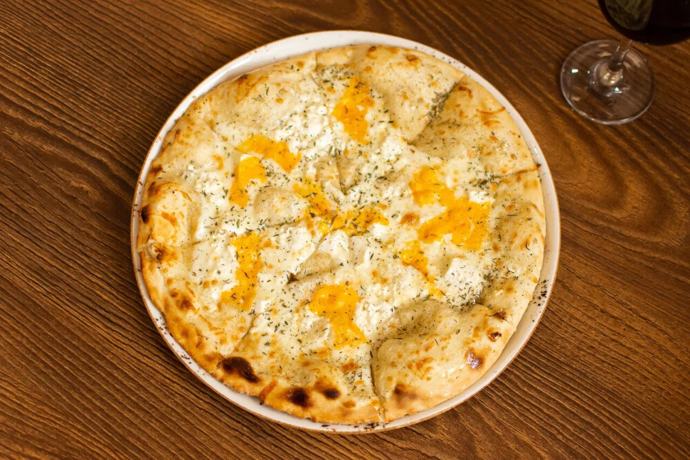 Тесто, соус «Сливочный», сыр «Моцарелла», сыр «Фета», сыр «Чеддер», сыр «Кремчиз», специи