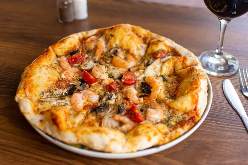 Тесто, соус «Том ям», сыр «Моцарелла», филе цыпленка запеченное, креветки, шампиньоны, черри, специи