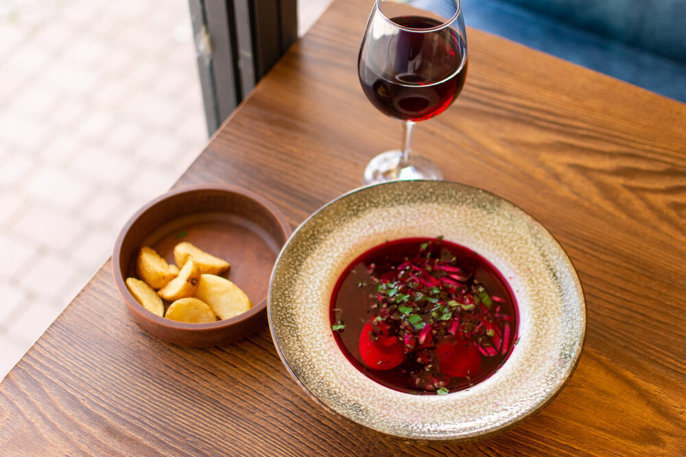 Холодник «Белорусский» со сметаной, перепелиным яйцом и печеным картофелем