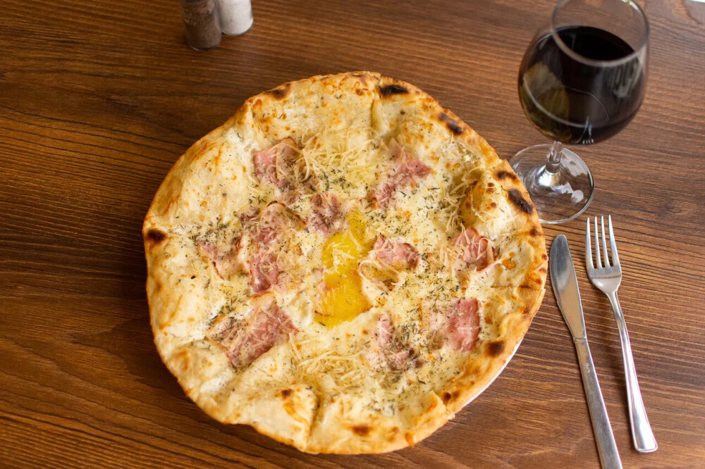 Тесто, соус на основе сливок, сыр «Моцарелла», бекон, специи, яйцо, сыр «Пармезан»