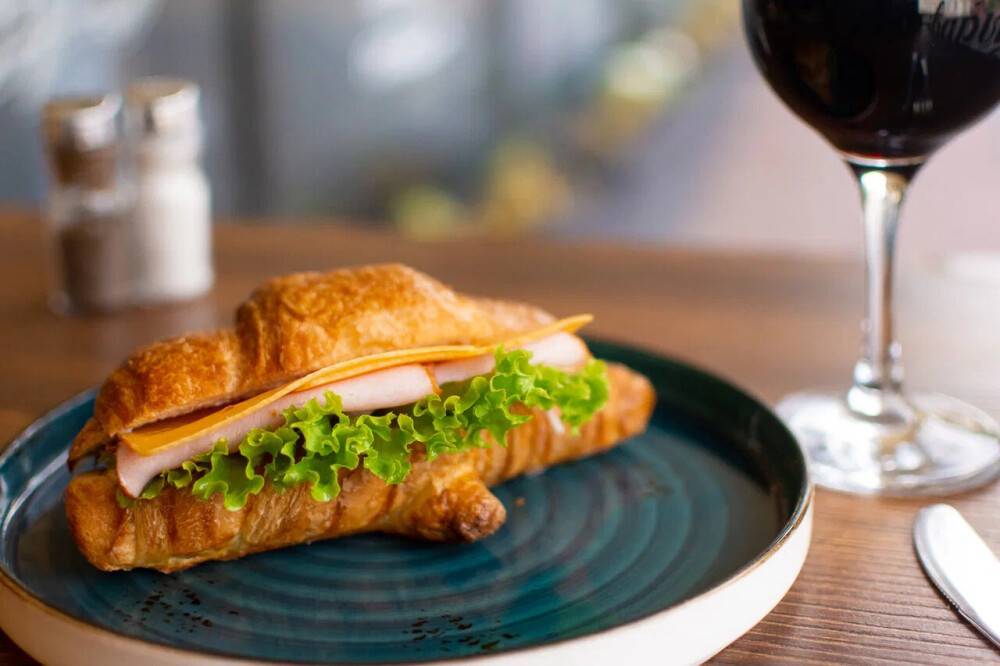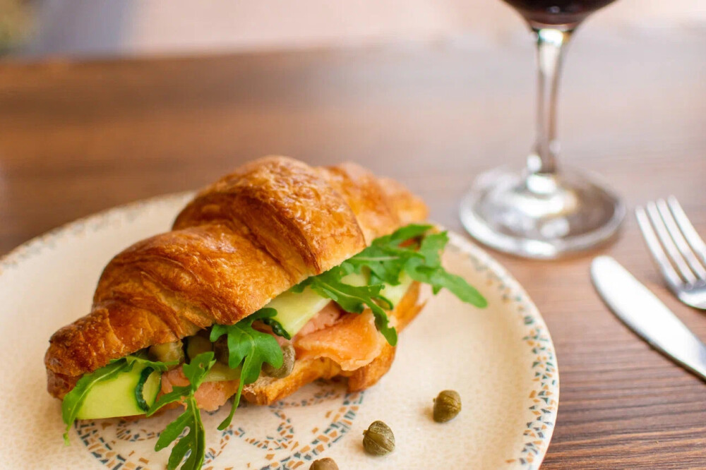 Круассан-сэндвич с лососем, зеленым крем-сыром, огурцом и каперсами