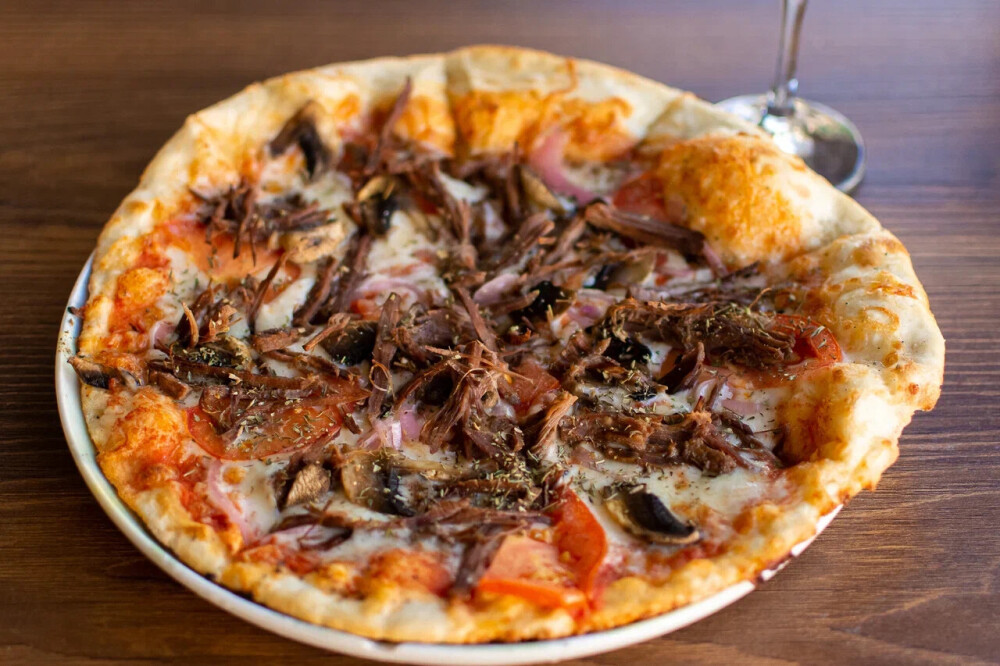 Тесто, соус «Пелати», сыр «Моцарелла», говядина рваная, лук, помидоры, грибы шампиньоны