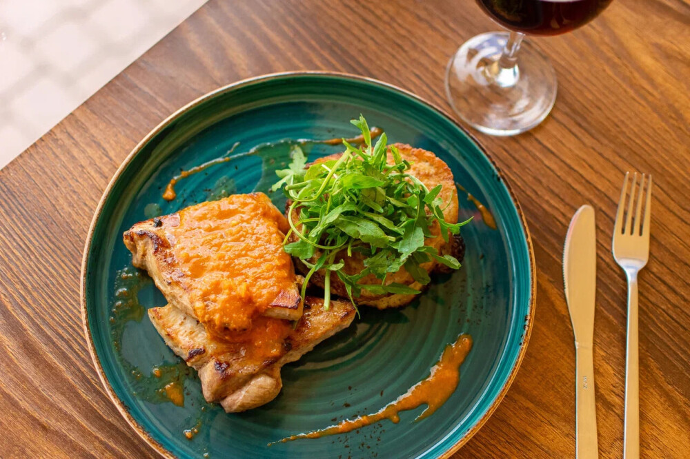 Томленая свиная шейка с орехово-картофельным кремом и овощным соусом