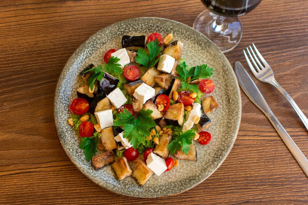 Салат с хрустящими баклажанами, помидорами, брынзой и арахисом «Кимчи»