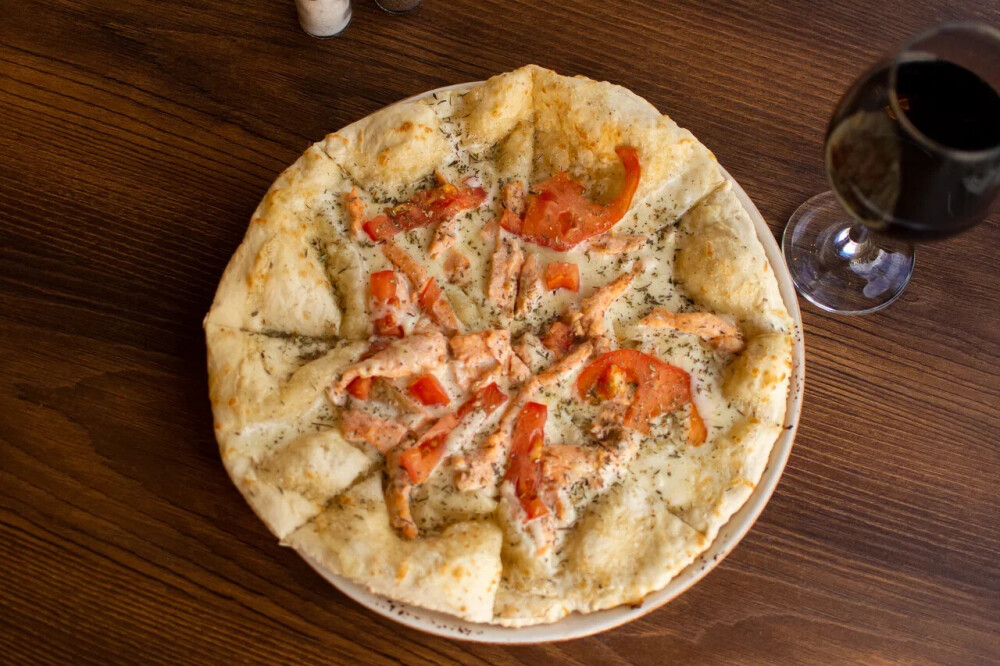 Тесто, соус «Альфредо» сливочный, филе цыпленка, помидоры, сыр «Моцарелла», специи