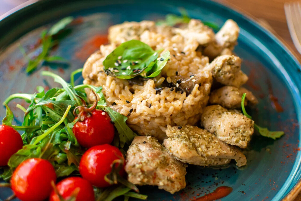 Цыпленок «Борджия» с грибным ризотто и помидорами «Кимчи»