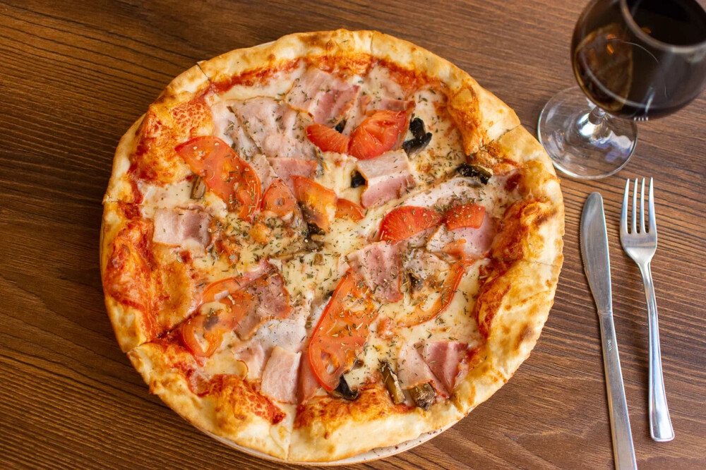 Тесто, соус «Пелати», сыр «Моцарелла», ветчина, бекон, грибы, помидоры, специи