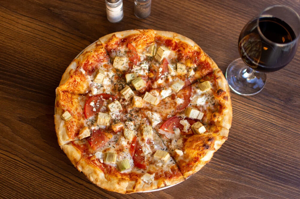 Тесто, соус «Пелати», сыр «Моцарелла», баклажаны, помидоры, сыр «Брынза», специи