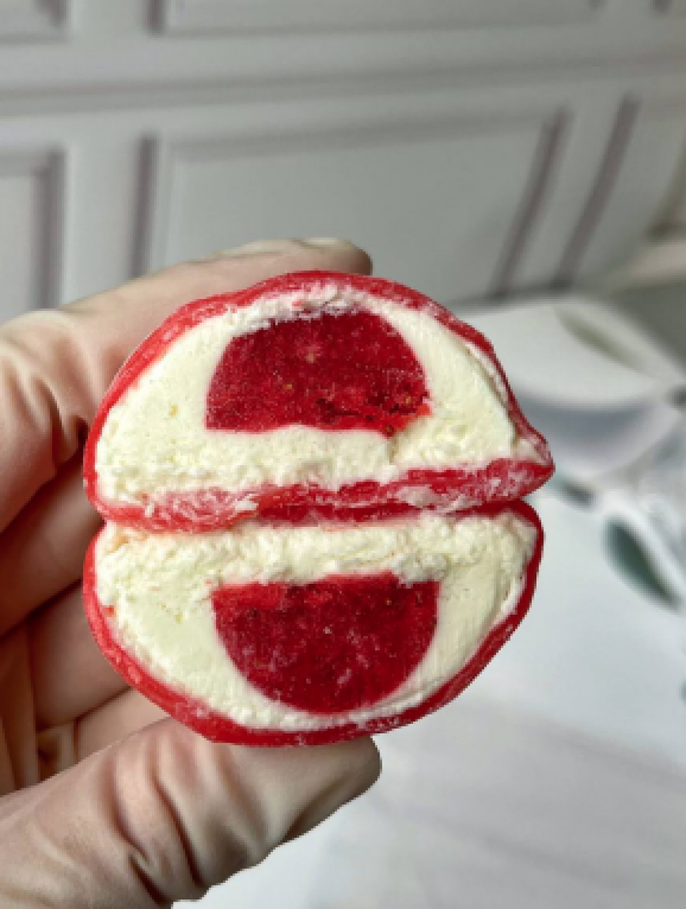Тесто, клубника, пектин NH, пудра, мусс (белый шоколад, сливки, печенье «Oreo» клубничный)