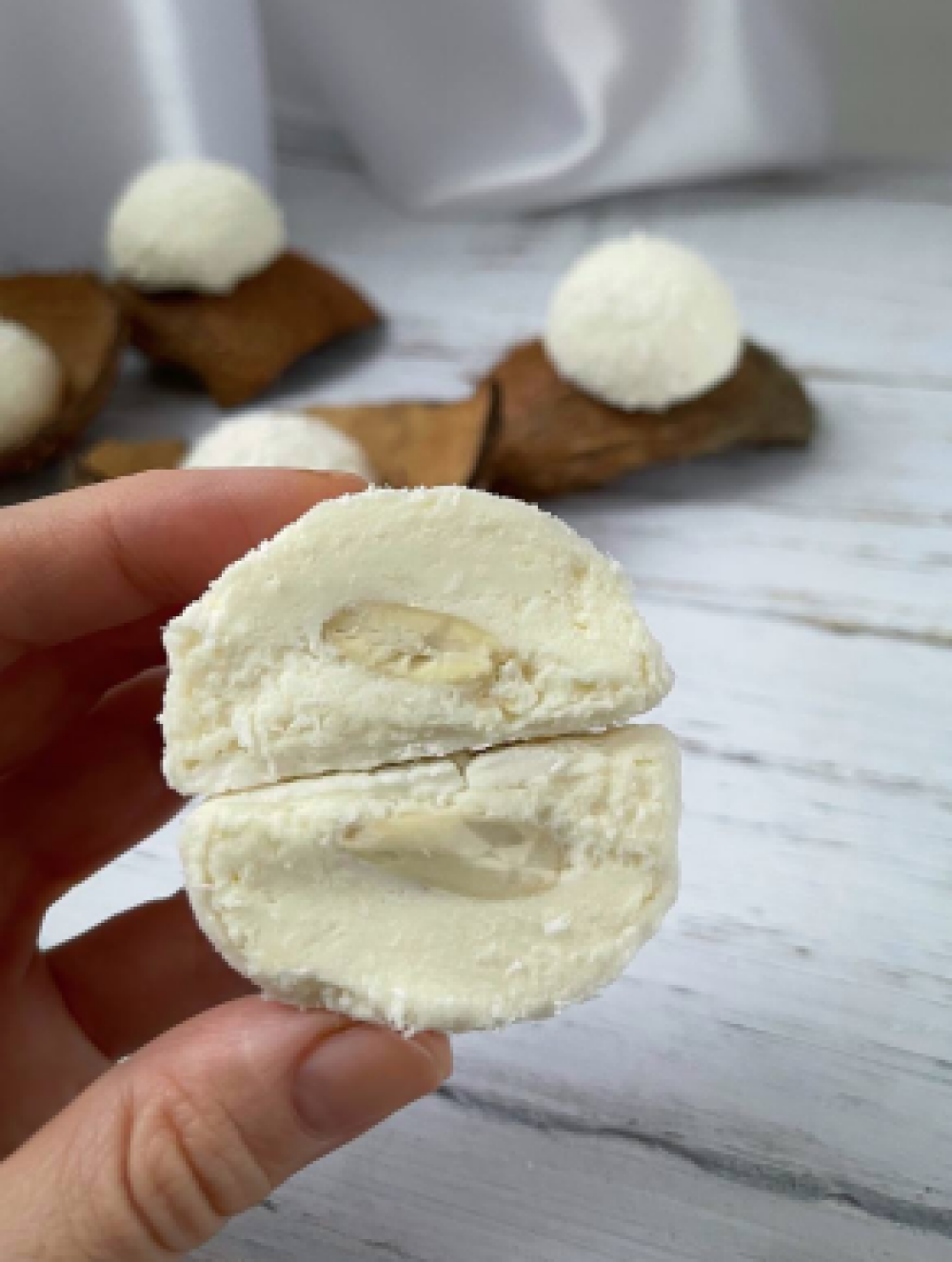 Тесто, сливки, сыр «Маскарпоне», белый шоколад, кокосовая паста, миндаль
