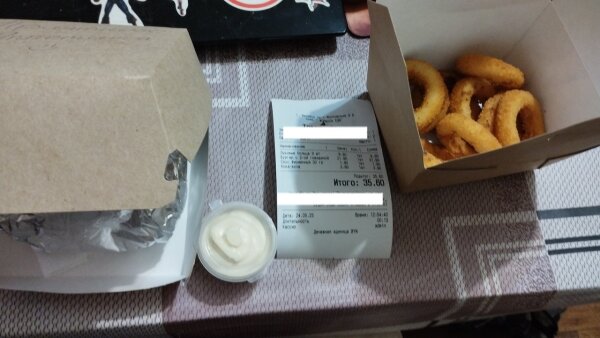 Вкусно. Сытно. Перчатки для бургера в комплекте. Спасибо.
