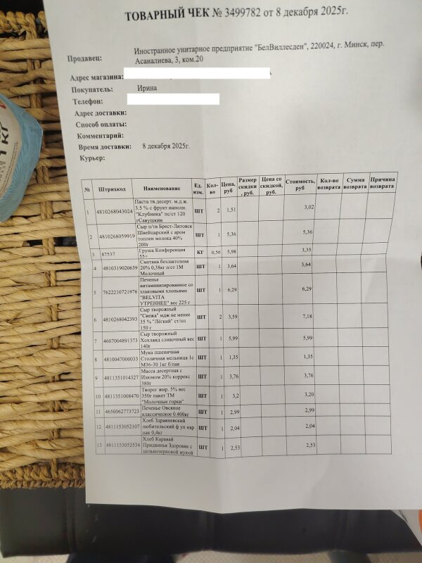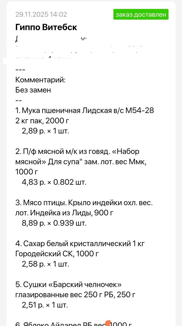 Доставка от 17.11.2025г, товарный чек 3454989, штрихкод 79506 рыба хек морож. 0,938г ,цена11.19⁰вся гнилая, поишлось всю выбросить. Зачем же вы ложите пенсионеру,который не может ходить такой товар, лучше совсем не ложите.
