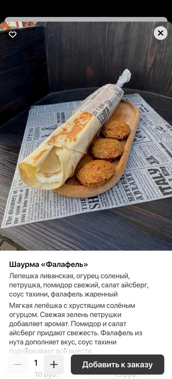 Брала шаурму с фалафелем и сырные палочки - лучшие из тех, которые я пробовала. Отдельно брала фалафель - хрустящий снаружи и мягкий внутри, хумус - приятный по текстуре и вкусный. Семье брала фалафель на тарелке, всем очень понравилось.