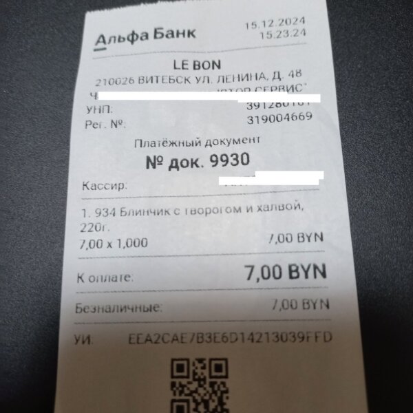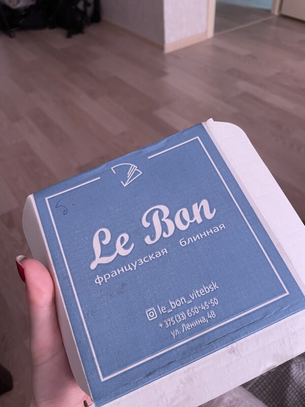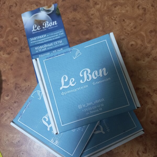 Заказывали в Le Bon к приему гостей из Смоленска 6 блинчиков.Наши гости уже бывали в Витебске и завтракали в этой блинной.Поэтому снова были непротив,если мы угостим их блинчиками.Все начинки хороши.Наверное есть только замечание к блинчику "баварский".Тот,кто именно эту начинку просил заказать,сказал,что стало мало в ней хрустящего лука,а это именно та изюминка,которая понравилась.Блинчики с начинкой три сыра,с сервелатом и итальянский,-все понравились.Доставка очень быстрая,несмотря на час пик и блинчики были горячие.