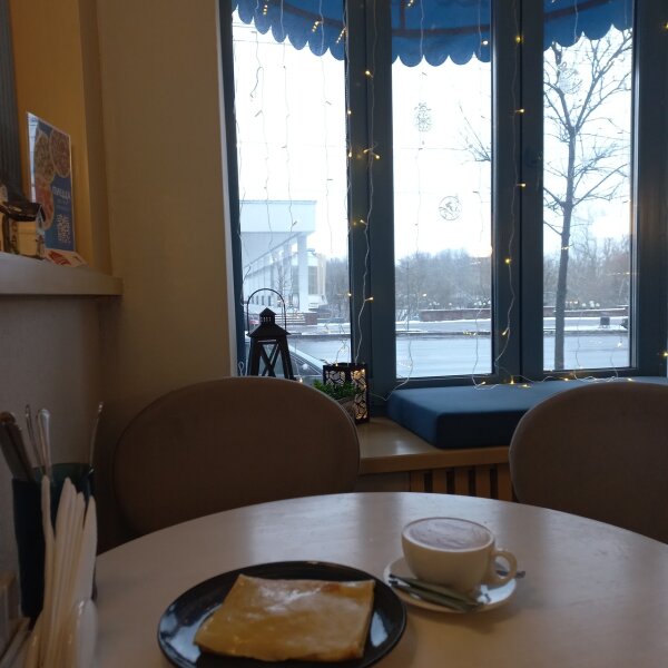 Отличное сочетание начинки в блинчике "творог и халва".Он сытный,и приятно,что в начинку не экономят количество ингредиентов.Нравится,как готовят кофе флэтуайт в этой блинной.Сервис самый пииятный и быстрый.