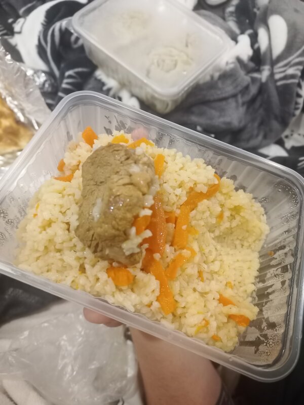 Плов очень вкусный, говядина тает во рту , 400 г на одного это очень даже много и сытно , в комплекте лежит морковка пряная и лепешка , все тёплое доставляют.