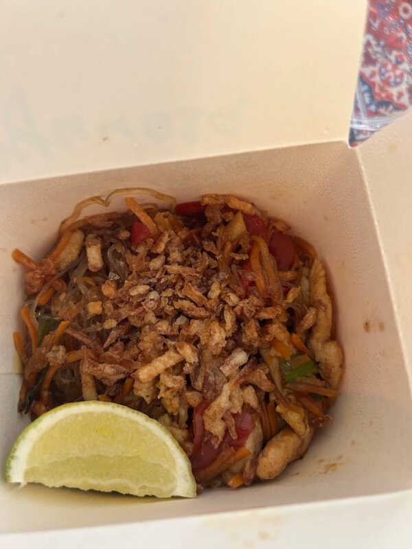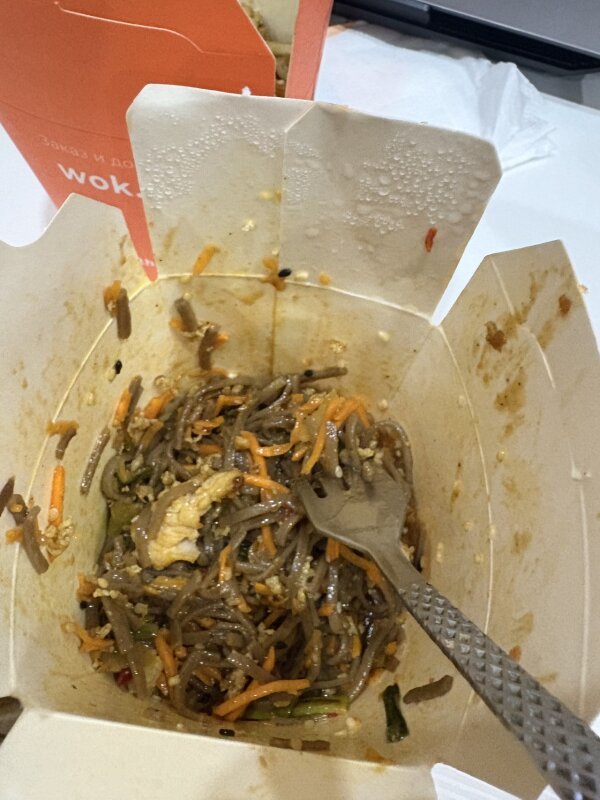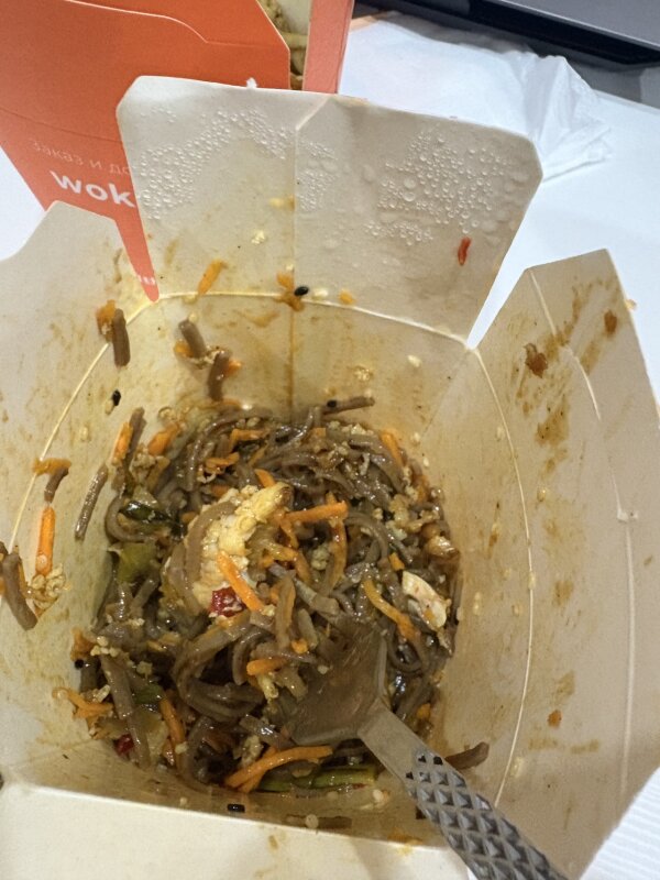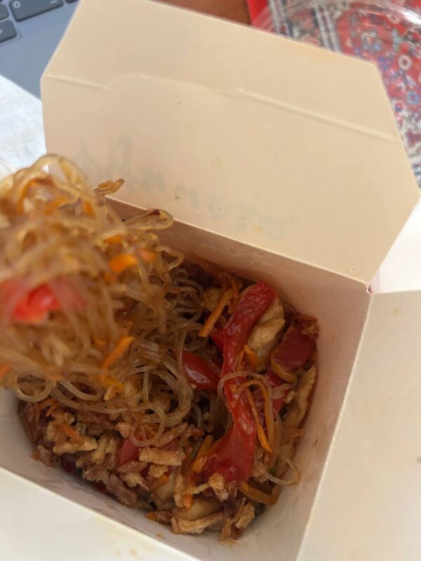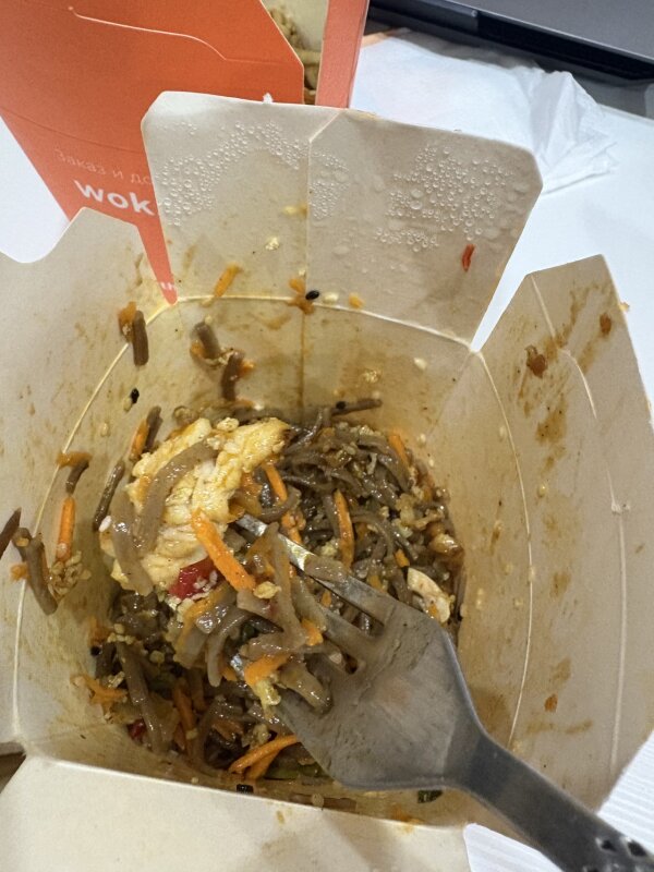 Вкус: вроде бы и вкусно, но... Как будто хочется какого-то колорита тайского, что ли. Но вкус напоминает блюда, которые я готовлю дома, пытаясь «закосить» под тайскую кухню :( Нет сомнений, что продукты свежие, всё приготовлено, скорее всего, по конкретной проверенной рецептуре, но... Несколько раз заказывали, да, вполне съедобно, питательно, но если говорить о том, чтобы попробовать тайскую кухню в Витебске — тут не порекомендую :( Исключительно за это минус балл по блюду.
