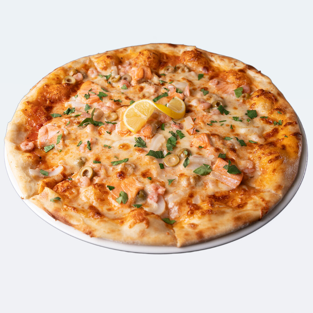 Семга, кальмар, креветки, оливки, лимон, зелень, сыр Моцарелла, соус, специи