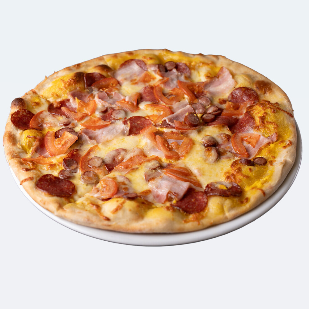 Салями, помидор, колбаски охотничьи, грудинка в/к, сырный соус, сыр Моцарелла, специи.
