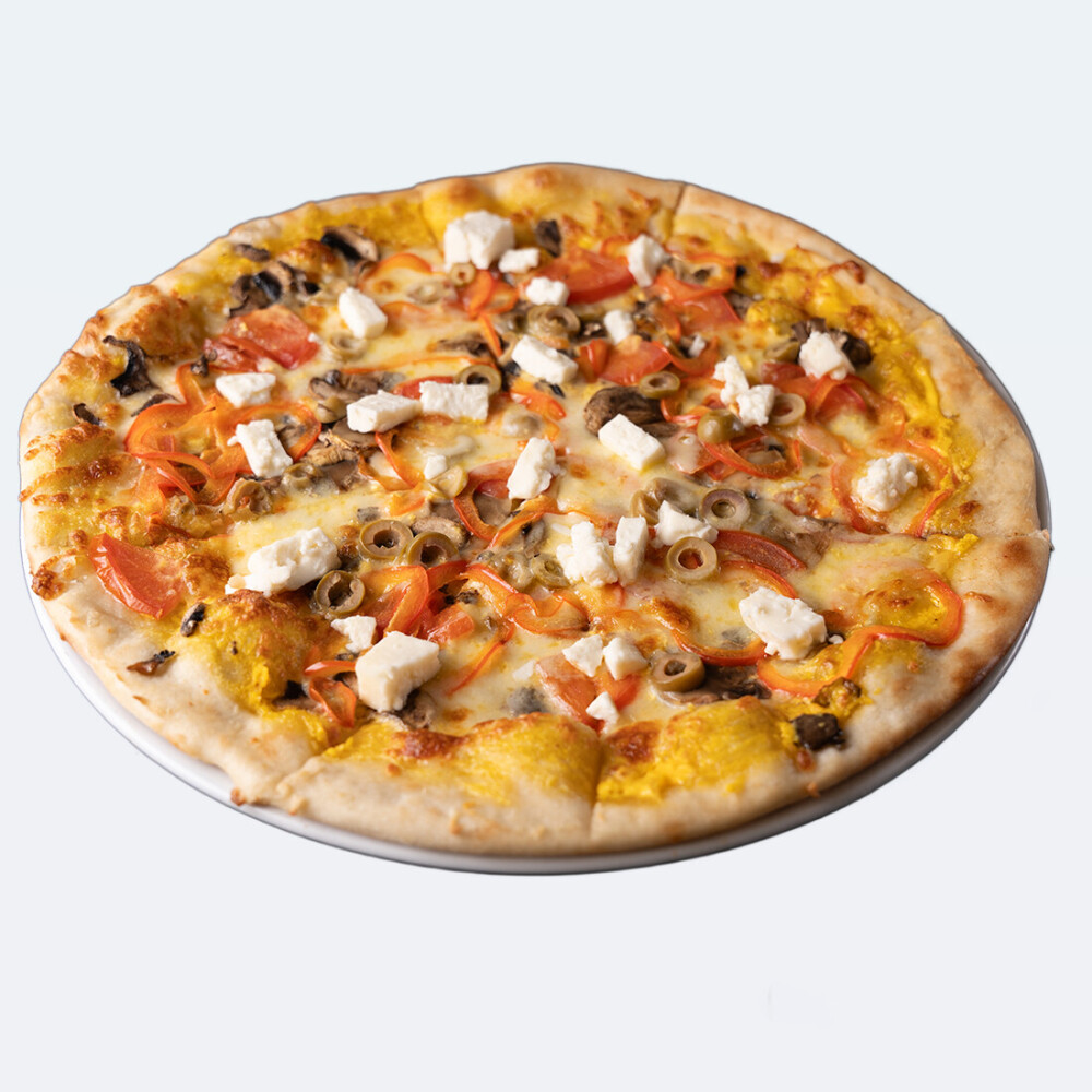 Перец, шампиньоны, помидоры, оливки, сыр Фета, сыр моцарелла, соус сырный, специи
