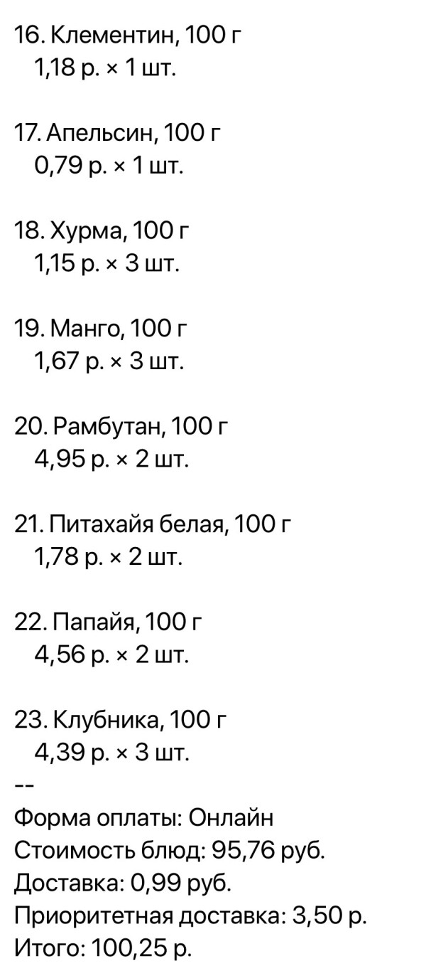 • рамбутан — 2 шт. × 4,95 руб. = 9,90 руб.