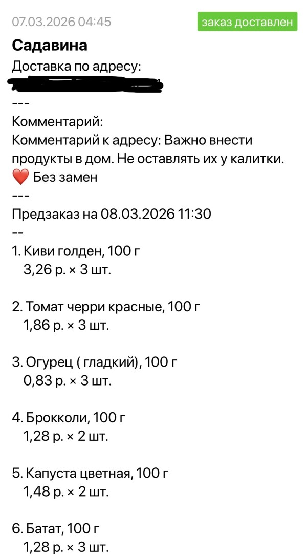 Время доставки: Крайне неприятный опыт с магазином Садовина в Витебске. Не советую заказывать здесь дорогие фрукты и овощи, особенно если вы отправляете доставку пожилым родственникам и рассчитываете на честность магазина. Заказ в приложении был отмечен как полностью доставленный, но по факту значительная часть оплаченных товаров не пришла. Не было: