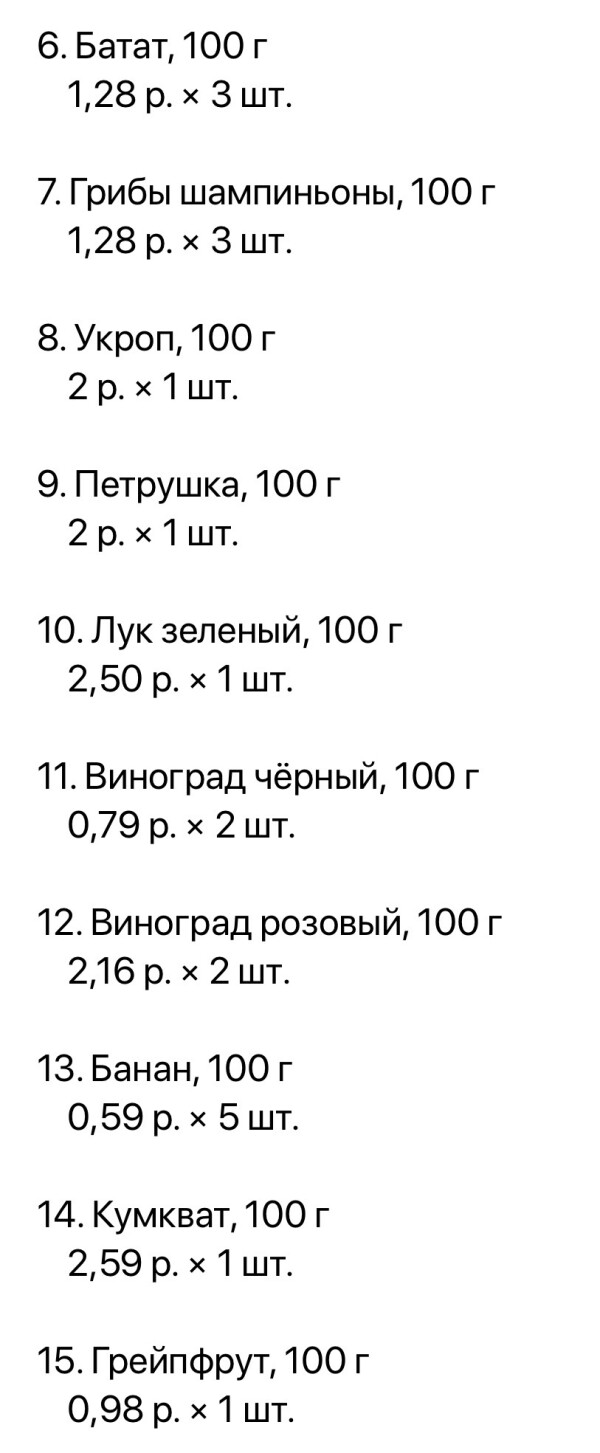 • батат — 3 шт. × 1,28 руб. = 3,84 руб.