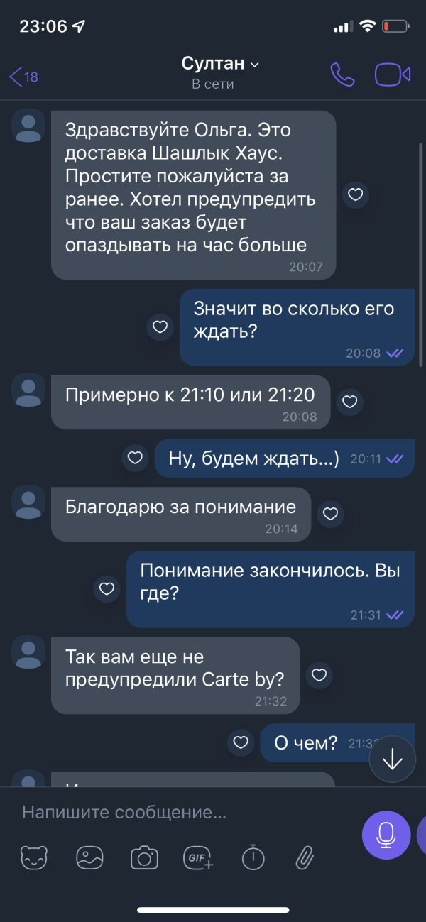 Вместо заявленного времени максимум 90 минут - доставили через 2 часа. Чека не было. Еда чуть теплая. Явный недовес. Ребра 200г - максимум 100г , кости 70%, шашлык из бедер куриных 200г - 2 шт грамм на 120. И это на 26 рублей! Ждите обращение в налоговую! Заказ был через картебай - почему-то отдали доставку на шашлык хауз. Уже не в первый раз такой обман! Почему нет чека? Серая доставка?