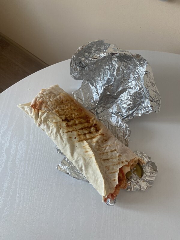 Шаурма огонь, много соуса, горяченькая как я просил, крч все четко быстро))