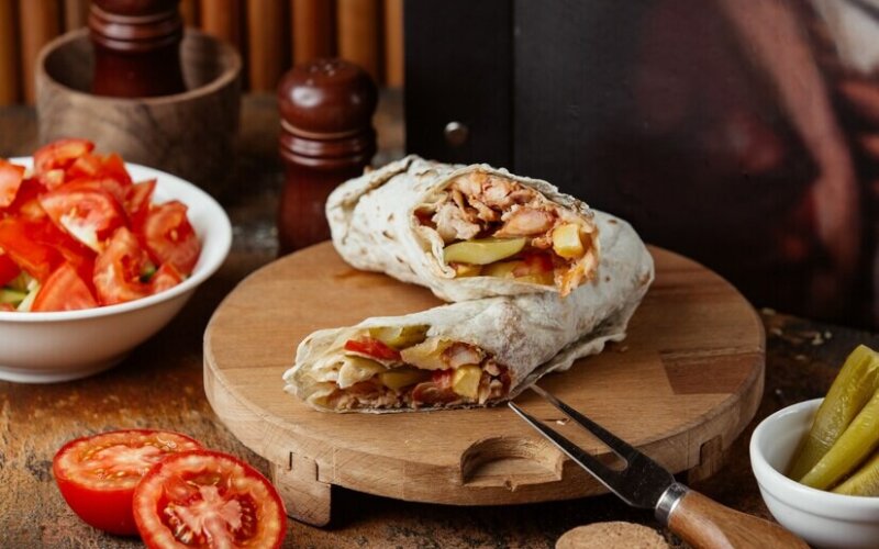 Лаваш армянский, курица гриль, огурец, соленый огурец, помидор, картофель, капуста, соус «Чесночный», грибы, сыр