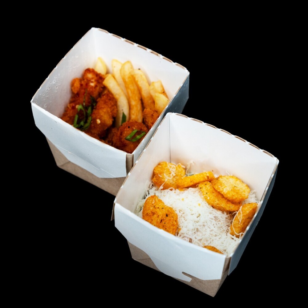 Салат "А-ля Цезарь" с курицей + Курочка и картофель фри с кисло-сладким соусом