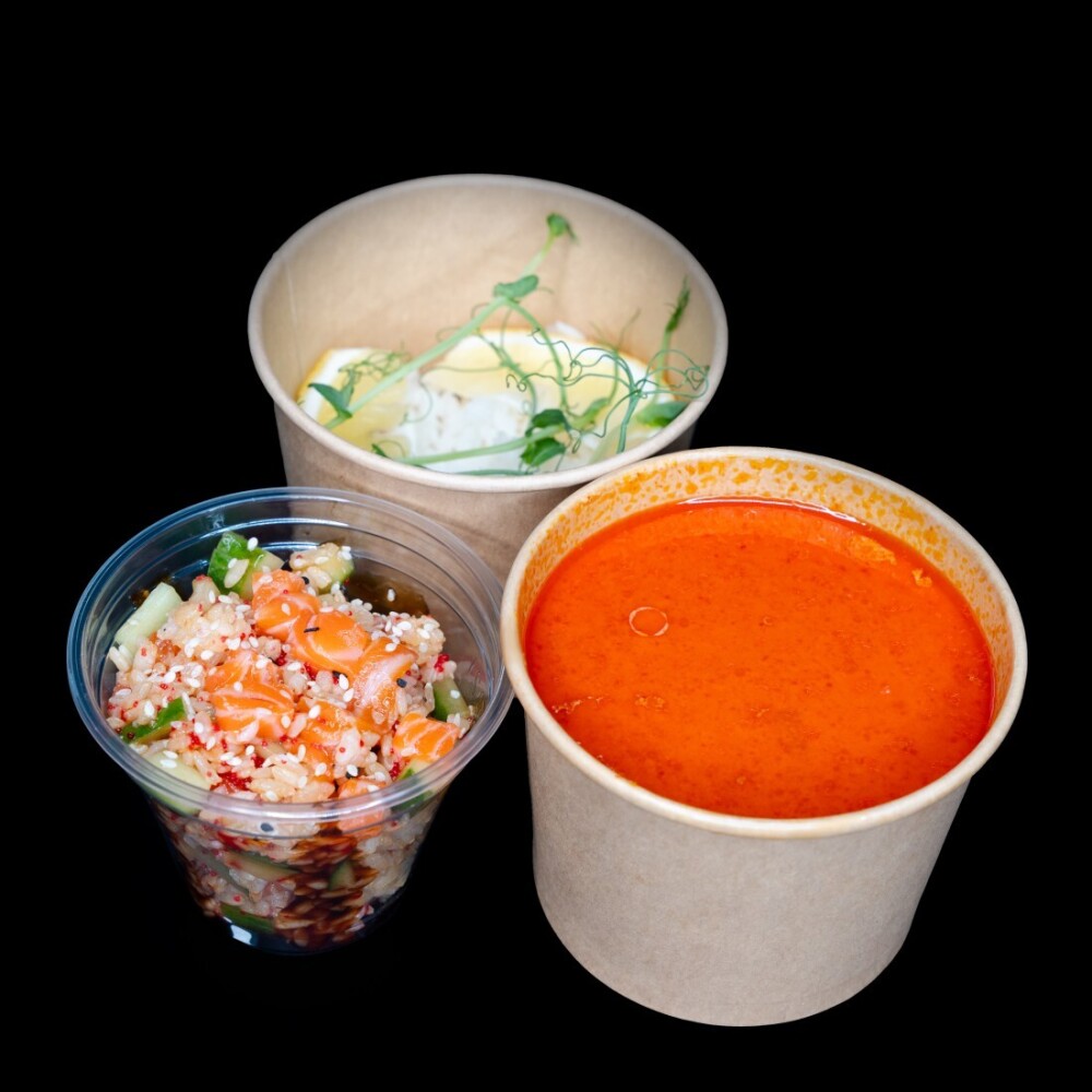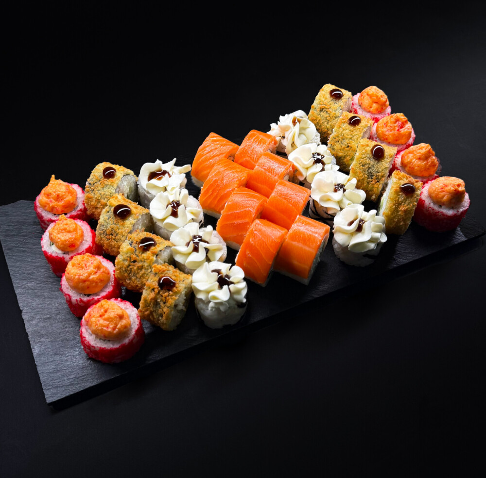 Ролл «Филадельфия с огурцом» (рис, нори, сыр «Творожный», огурец, лосось), ролл «Таманеги терияке» (рис, нори, лосось терияке, огурец, сыр «Творожный», соус «Унаги»), ролл «Темпура терияке» (рис, нори, лосось терияке, сыр «Творожный», огурец, соус «Унаги», ролл «Кинг ролл» (рис, нори, сыр «Творожный» , огурец, запечённая шапка из лосося, икра масаго), японский гарнир (соус «Соевый», имбирь, васаби)