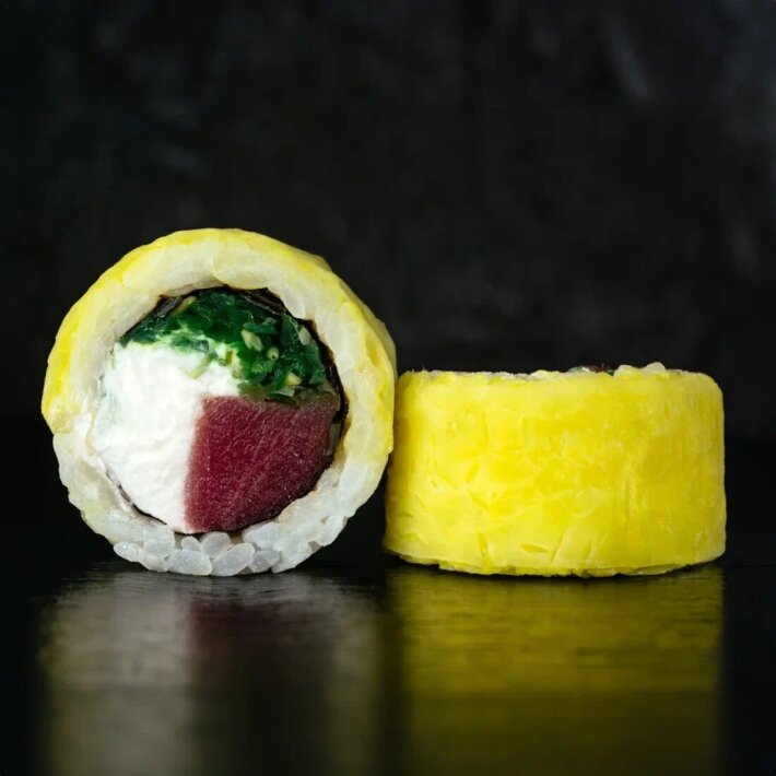 Состав: рис, нори, сыр, тунец, "Чука", маринованная редька "Такуан".