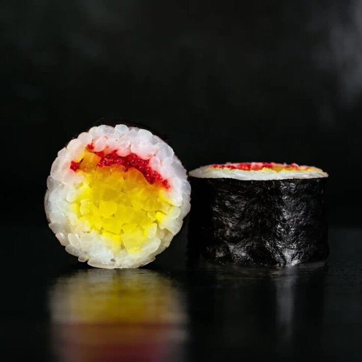 Состав: рис, нори, дайкон (маринованный редис), икра "Масаго".