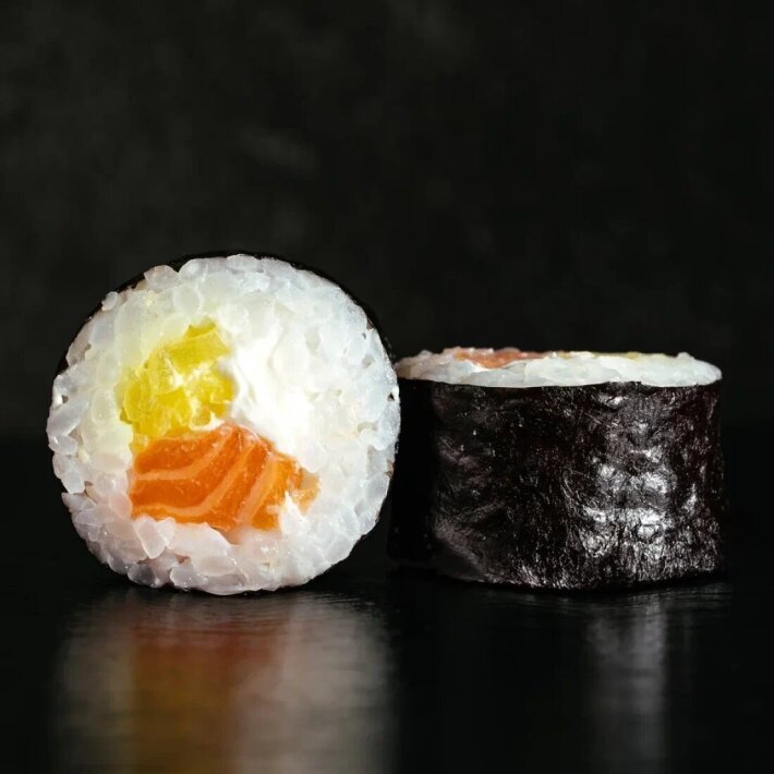 Состав: рис, нори, форель, сыр творожный, дайкон.