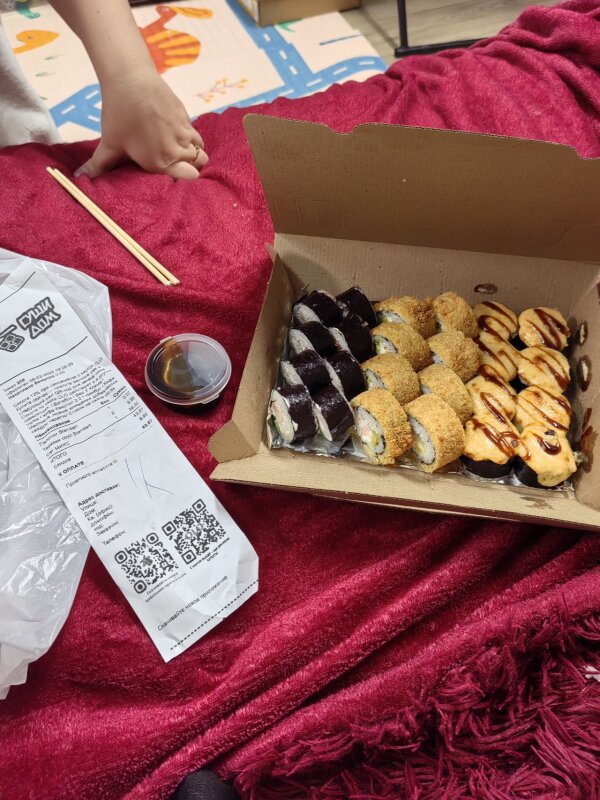 Заказ на 100р, три сета. Думаю, понятно, что на компанию. Ни соевого в наборе, ни васаби, ничего. Заказываю здесь часто, раньше будто бы хотя бы что-то было в наборе
