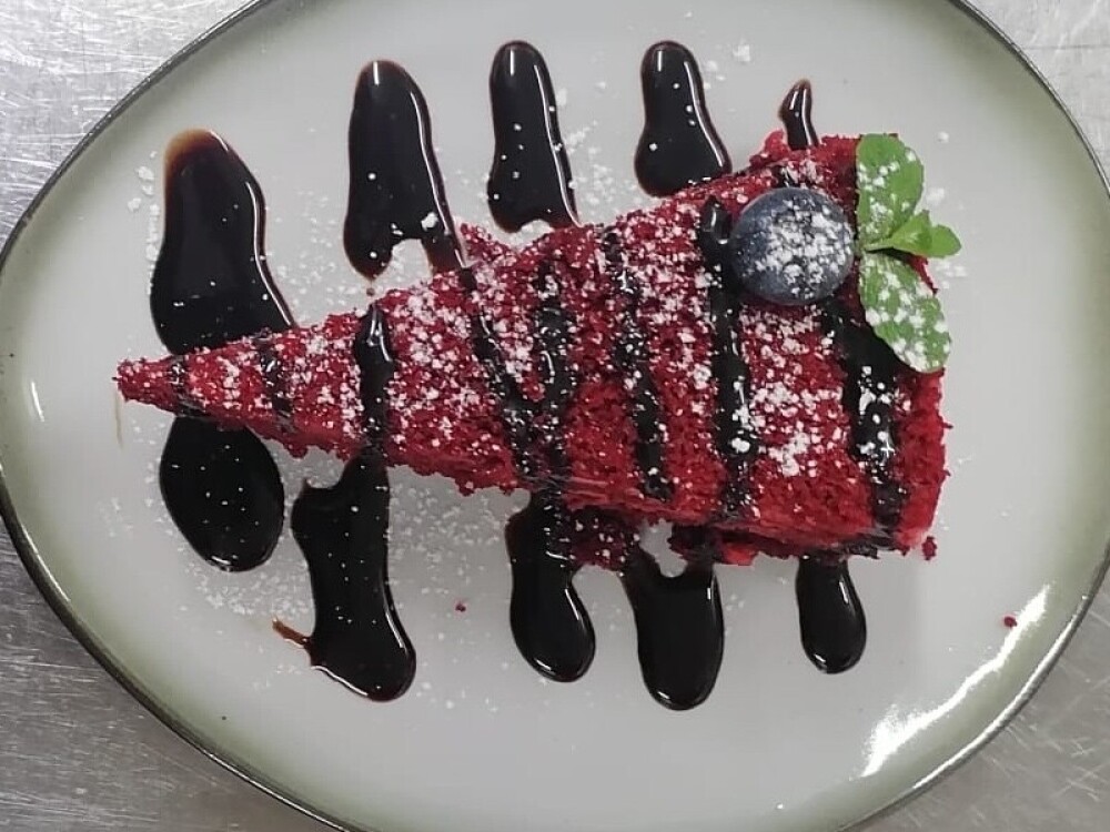 Десерт Красный бархат с шоколадным топпингом