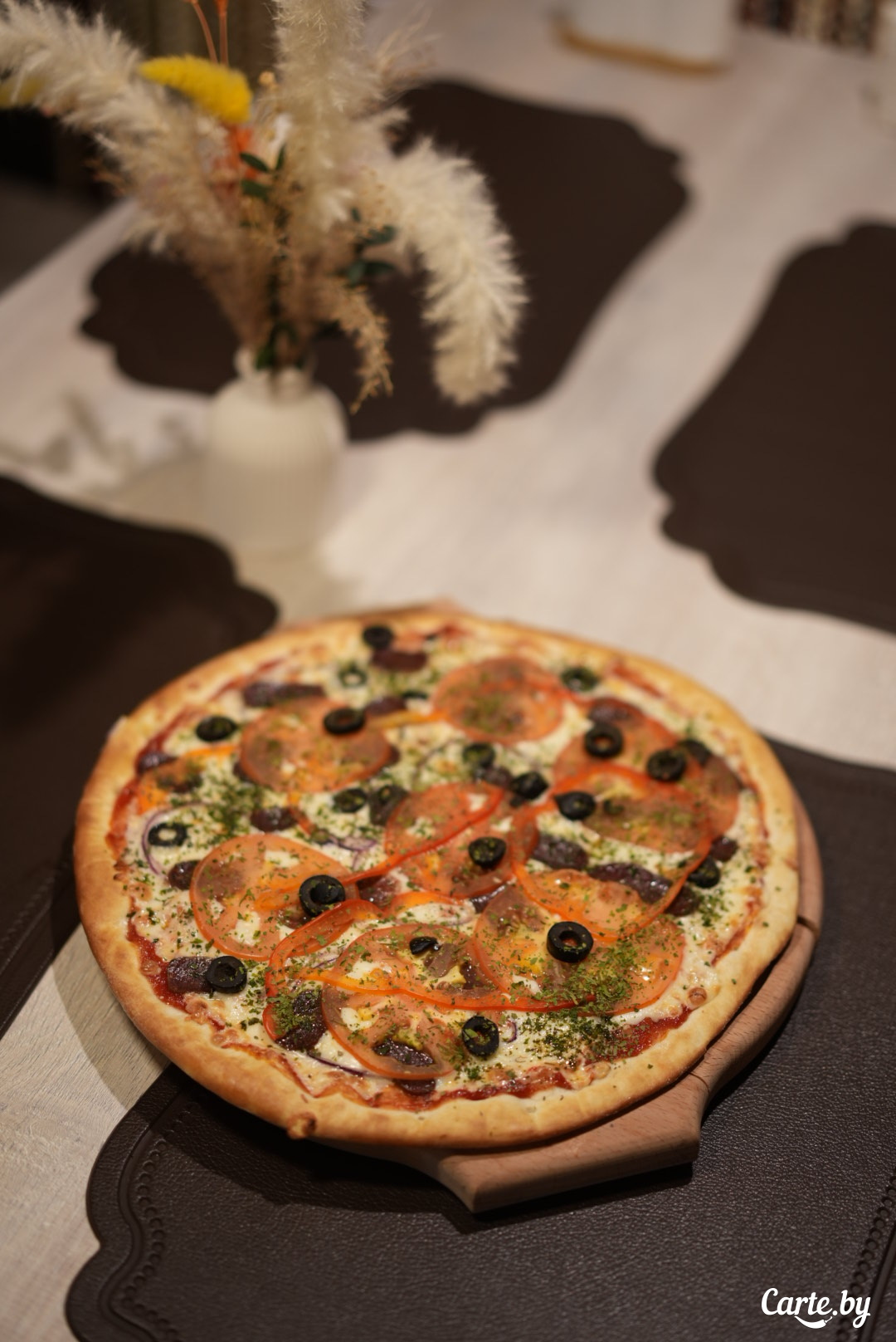 тесто, соус итальянский, сыр Моцарелла, салими говяжья, лук, томаты, перец сладкий, маслины, базилик
