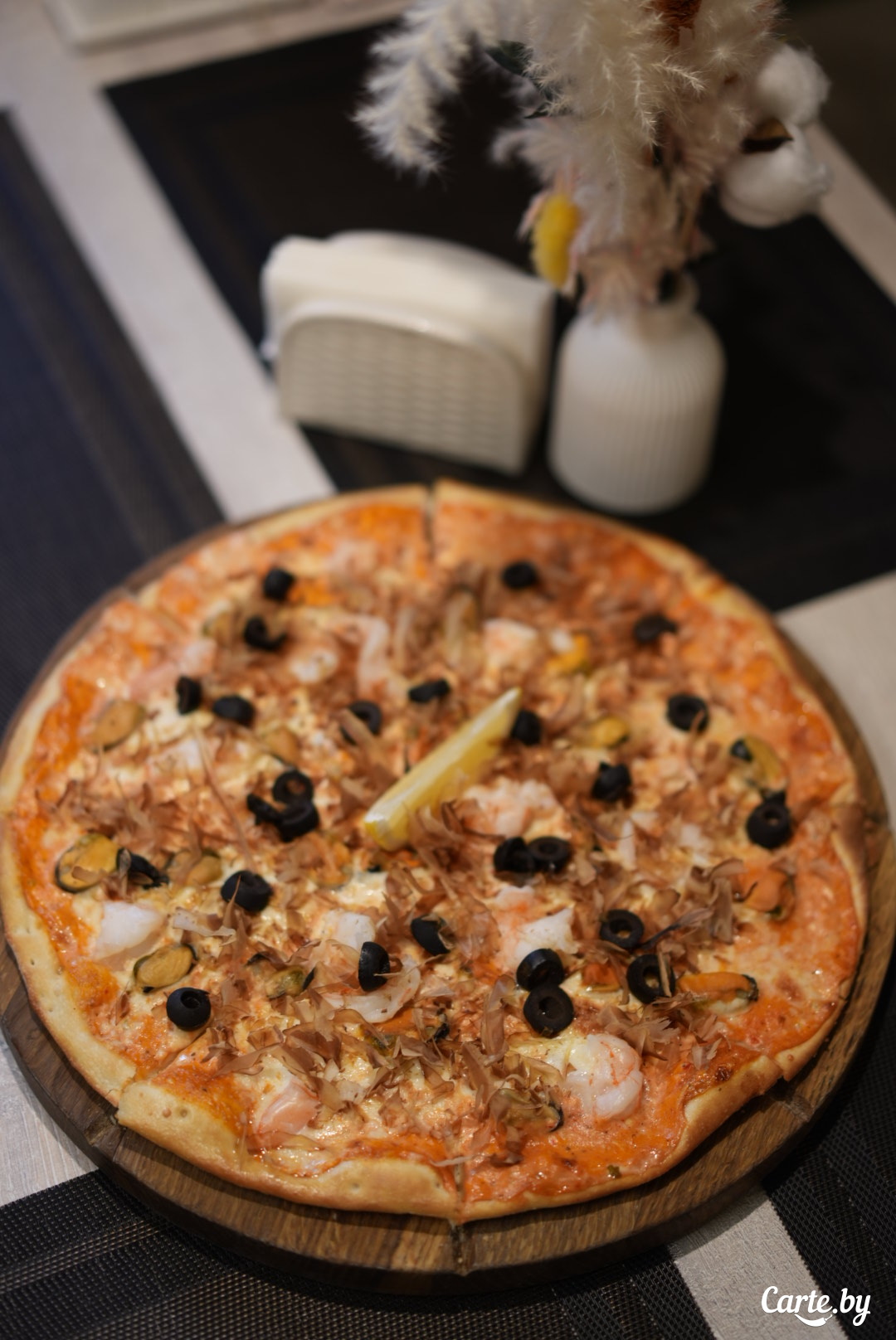 тесто, соус итальянский, сыр Моцарелла, мидии, креветки, стружка тунца, лимон, маслины