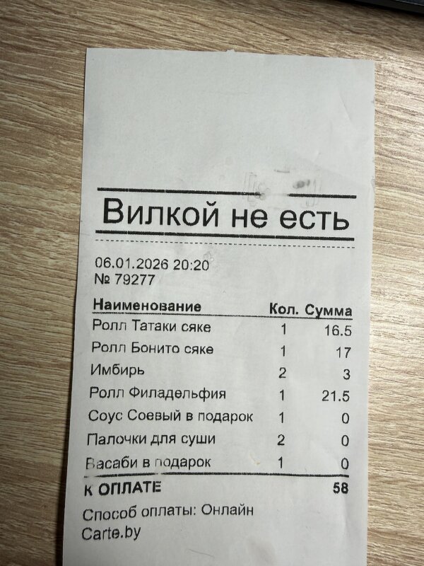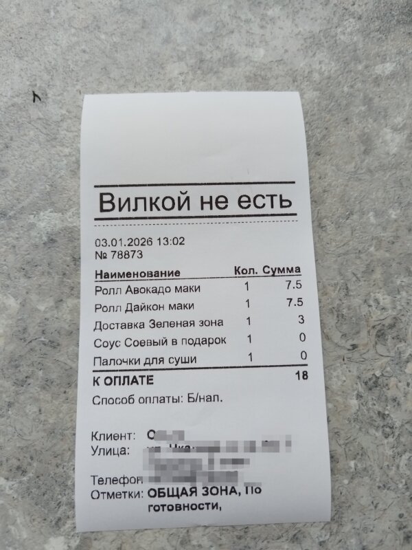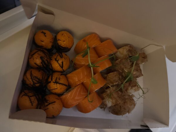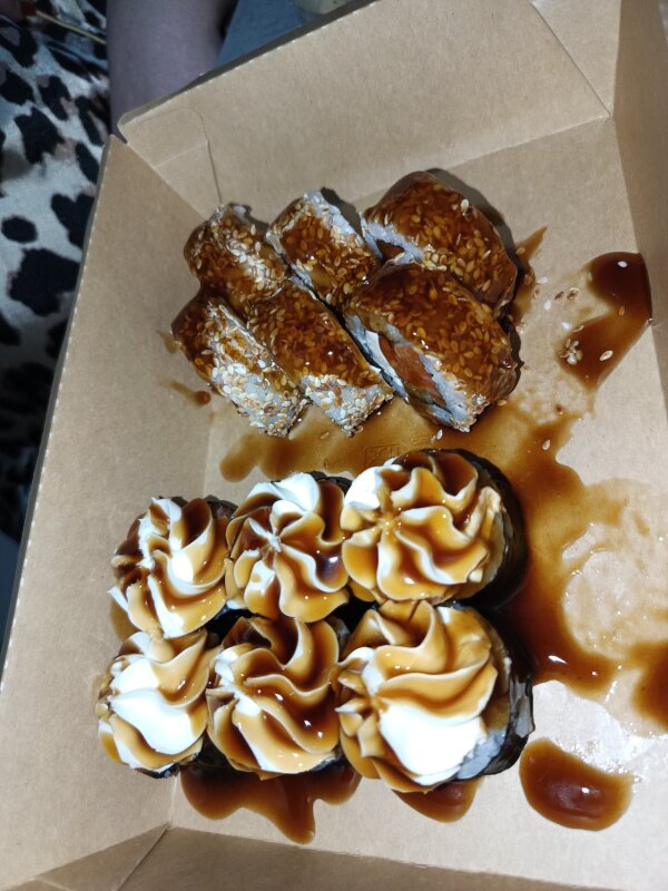 Заказываем первый раз у вас!!! Жена постоянно заказывает Вилкой не есть!!! Т к доставка там не работает сегодня, решили остановиться сдесь, мы в восторге, сервис работает на ура, доставили раньше, оформления 🔥 всё красиво, всё круто, а самое главное, всё очень вкусно!!! Спасибо большое ребята!!!! Будем теперь и у вас заказывать, фото прилагаем, жена уже кушает!!!!!