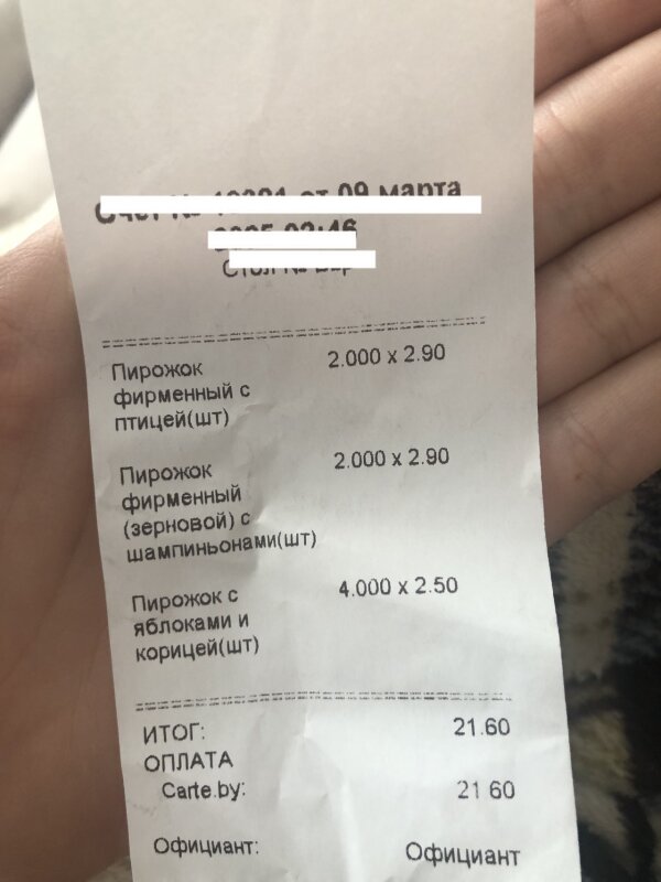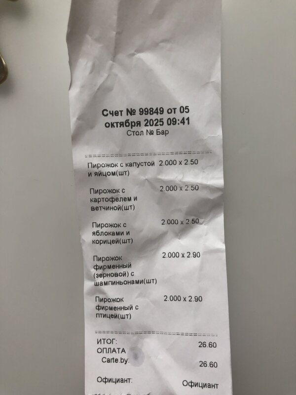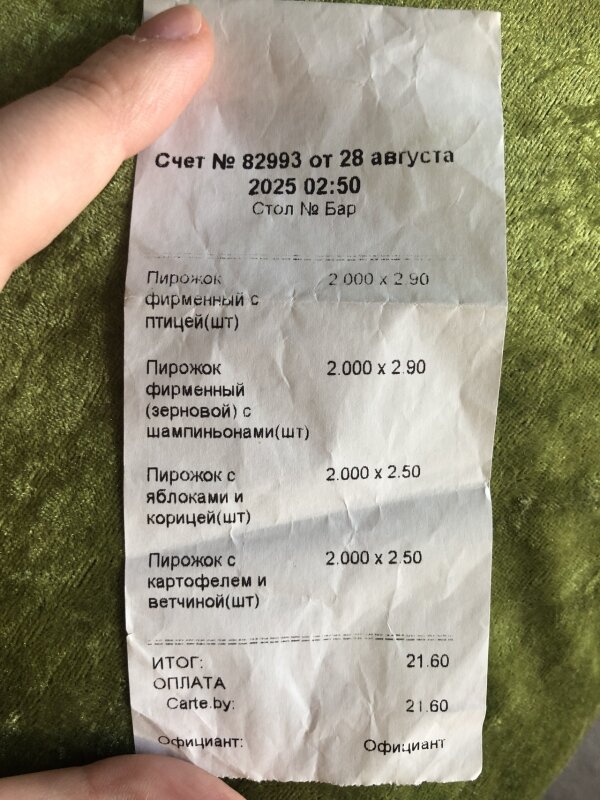 Один пирожок с яблоком был с сырым тестом. Заметила, когда часть уже съела , т.к. края были зажарены, пирожок держала салфеткой и подумала, что от жидкой начинки выпечка размокла немного внутри (жарят профессионалы, регламентированное время. Они же не могут отдать сырое тесто) . Потом развернула, а там с одной стороны от обжарки фри лишь тонкая пленочка схватилась и разорванными кусками лежала на сыром тянущемся тесте.☹️ Всю ночь после такого сюрприза не спала из-за резей в животе и сильного вздутия 👍🏻.