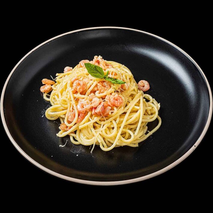 Спагетти, креветки, сливки, сыр сливочный, чеснок, масло сливочное лайм, базилик . Рб